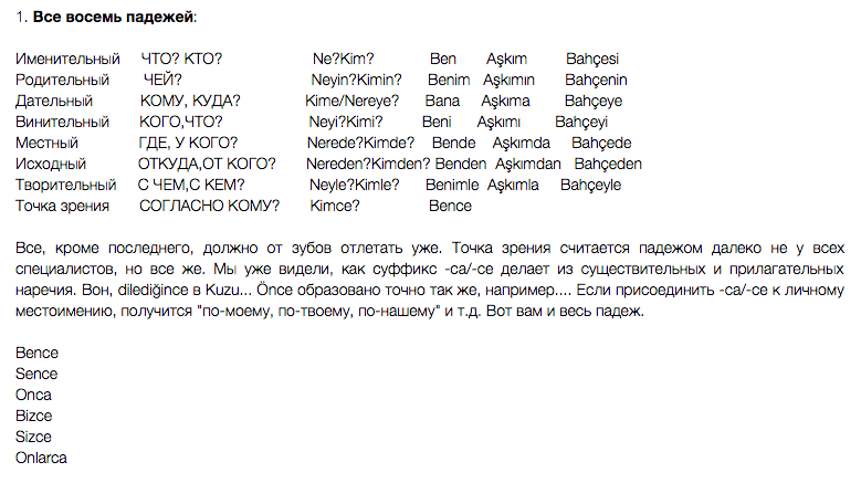 В сумме - 57 русских значений. И это я еще не все русские предлоги прописала, которые у турков в падеж зашиты могут быть... То есть.. Я говорю "Который", а имею в виду "который+56". Круто, правда? Вот сейчас одни из вас подумают "Засада! Из 57 значений одно надо выбрать, чтоб на русский перевести!", а другие подумают "Боже, какое счастье! Не надо выбирать из 57 значений, чтобы перевести на турецкий слово. У них одно по цене 57 идет!"... А третьи подумают "Бедные турки, изучающие русский! Им надо учить 57 слов с предлогами на то, на что у них в голове одним-единственным словом живет".
