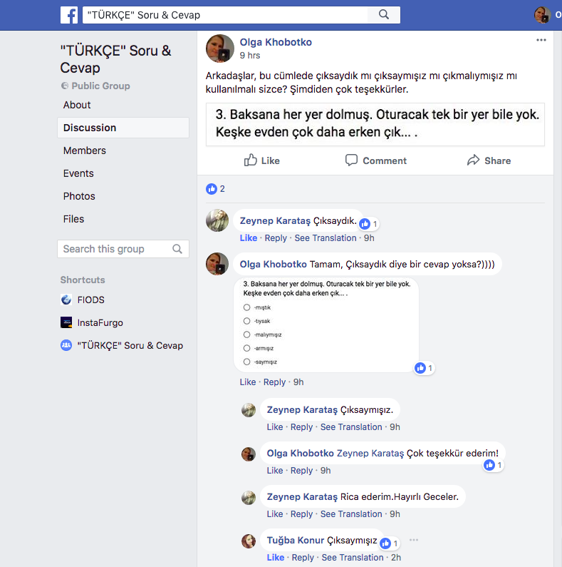 Но фишка в том, что, в отличие от большинства турок, лично я - чётко понимаю, как работает их язык. Я его как будто сама создавала. И если я говорю "Нет", то это с вероятностью 99,9% "Нет". Вот НАСТОЛЬКО я уверена в том, что знаю. Потому что не прочитала где-то, и не поверила кому-то на слово, а сама открыла когда-то. Сижу-думаю "Вот где найти умного турка, чтоб защитил мою версию?"... Посмотрела, нет ли в TDK какого адреса, где вопрос можно задать. И нет. Очень зря, кстати. Могли бы и сделать... Но нашла группу в фэйсбуке. Там турецкие лингвисты сидят, умные грамматические проблемы обсуждают. Я... среди ночи... пошла спросить у них.