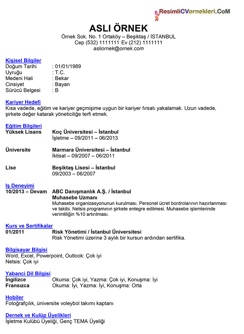 Если кому-то реальное резюме на турецком надо сделать, то вот образец: