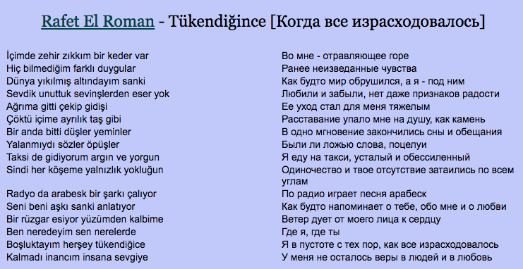 Но Рафету повезло. Пришли мы - существа, которые точно знают, что именно он всё-таки спел в этом tükendiğince. Да? Да!... Докажите мне это... Хочу от вас перевод этой строчки (Boşluktayım herşey tükendiğince). Потому что тот факт, что эту деталь точно знаю Я, для меня не утешение. А утешение для меня - знать, что это знаете ВЫ, что я вас научила...