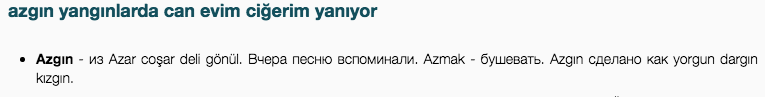 - argın - Гугл опять такого не знает, а Правительство знаааааает. Синий Ататюрк! Я тебя люблю!... Он говорит, это bitkin. А у нас антилопыш bitkin düştü сразу после Серенгети, и его стервятники съели, помнится. Поэтому, вывод? - "Изнуренный". На argın yorgun очень легко запоминается... Так, а azgın чего такое, кто помнит? Только быстрее давайте вспоминайте... Из Зубастика... Из Zor Тэтэшенского yani...