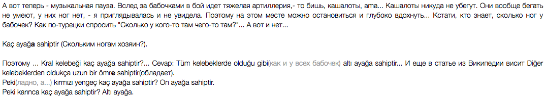 Кто seçilmeyi не слышит у него? Я... Потому что, по-моему, он говорит "seçinmeyi". А такого нет. В смысле, есть, но это ошибка. Тэтэшечка, помнишь, ты меня вчера почти нанял своим адвокатом?... Я подаю в отставку... İstifa ediyorum... Забери обратно свои ключи от квартиры... Потому что я очень хочу тебя отмазать, но у меня, видимо, таланта не хватает. Yeteneklerim yetmez galiba. Все, у кого на интернете написано seçinmeyi, - неграмотные турки. У них в других словах их предложений куча ошибок,- сразу доверие утрачивается. Hemen güven kaybettim. Но я так "хочу верить", что... я готова признать, что дура - я. Люди! У меня наверняка кривые уши. И у всех вас - тоже. Он говорит seçilmeyi, а мы (я) - просто неспособны это услышать... И даже если проведут судебную экспертизу и докажут, что он сказал seçinmeyi,- я всё равно скажу "и даже после этого - я не Ипполит". Ну мало ли,- язык поскользнулся. Главное, что ДУМАЕТ он - seçilmeyi... Доказать обратное - невозможно, поэтому - Тэтэшечка, мы в шоколаде. Срочно нанимай меня обратно... и возвращай ключи от квартиры, - я там еще не все кепки повыбрасывала.