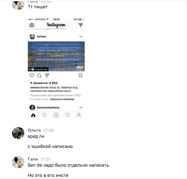 Как твой адвокат, скажу тебе... "Всё! Я увольняюсь. Tekrar istifa ediyorum"... Или срочно повышай мне зарплату,- у меня работа вредная... Нет, денег не надо... Просто оставляй конфеты на столе каждый день... Короче... Люди!... Это он был в душе, и он попросил жену запостить что-нибудь про спасение зверюшек в его Инсту. Она сделала перепост чей-то с его телефона, а он кричит ей из ванной: "Припиши там Sen de itiraz et, че-там-за-название kuş cennetini bu haksızlıktan koru!"... Ну, она и приписала... Тэтэшечка, ты просто в следующий раз кричи ей Sen de с паузой подлиннее, как ты умеешь,- и всё. Договорились?... Отлично... ... Про конфеты не забудь. И у нас остался серый гиббон. Это тоже научное название.