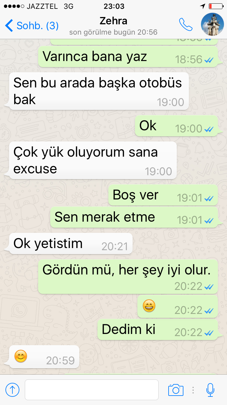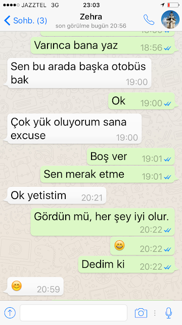 Yetişmek- успеть... Из урока Gün gibi мою переписку с Зехрой помните? (Опять железная логика. Мы песню вообще разобрали? Или всё выясняли про ноги бабочек и как не опоздать на автобус?). Кто не помнит - Zehra - это турка, которую я себе по интернету в гости выписала тогда. Она в синем блоге приезжала, учительница французского на пенсии... Поехала на экскурсию куда-то, загуляла(сь), и не успевала обратно на автобус, который до меня шел... Я - зелёненькая, она - беленькая.