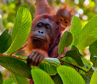 Среди первых прибывших - самые медленные животные этой местности - орангутанги.