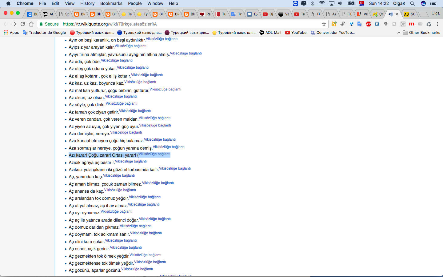 Галя считает, что я звезда, раз вычислила, что там ortası где-то должно быть в конце. А я не звезда вовсе. Просто я после Unut beni, где было Hüznüm yaralar seni, всё, что на AR кончается, под подозрением на глагол держу. Я - как Доктор Хаус: "Сначала исключим, что это Лупус")))). И поэтому я на ходу предположила, что karar - это глагол. А у него оказалось негативное значение... И это делало поговорку недосказанной. И я ПОЭТОМУ про середину подумала и пробила ее в Гугле. Назло сотням объяснений турков про соль, в результатах. То есть... я такая "умная" - с 22 мая 2015 года. Я ж говорю - я точно знаю, у кого я чему и когда научилась.