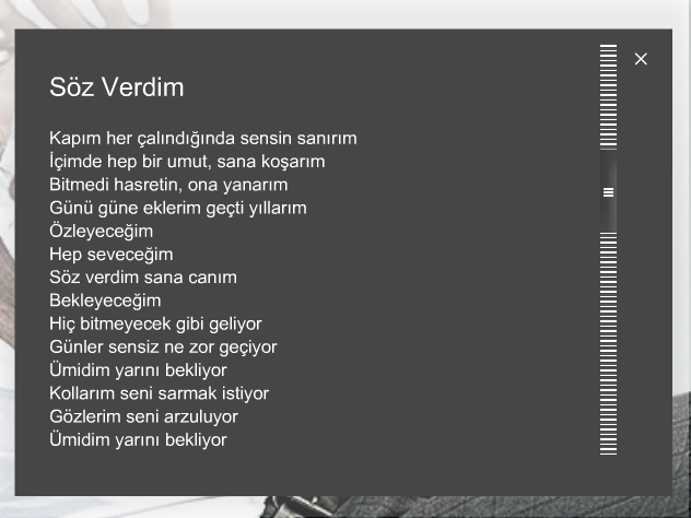 Как можно было узнать, что слова "не свои"? А очень легко. Наша Муза про любовь песни не пишет. То есть вообще. То есть совсем. Не верите? Назовите хоть одну. У него в голове висит большой красный знак Yasak на всё, что связано с выражением собственных чувств. Это травма какая-то психологическая, не иначе. Самое близкое, где он как-то подбирался к теме любви - это инструкции девушкам о том, как надо "правильно" любить (потому что он очень умный, наверное). Из этой серии Unutmamalı, Unut beni, Sorma kalbim, Bam Teli. Дальше он пробовал с другой стороны подойти, чтобы попытаться передать хотя бы свои страдания, уже всё равно на какую тему. Получалось что-то типа Arada bir (там песня начинается со слов "Ребят, у меня депресняк"). Ну и Pare Pare туда же: "Ой как жалко себя любимого... вообще в принципе...". А хорошо у него получилась серия "эй, девушка, идите сюда, давайте что-нибудь замутим" (тут вообще длинный список шедевров), и есть 1 (одна) песнь на тему "вот, девушку нашел, и мне сразу похорошело". Gün gibi, то есть. И всё. Остальное - стёб над окружающими... Облачко, дуй сюда, давай обсудим, чего у тебя за травма... Или ты думал, я не замечу, что ты все слова про любовь женщинам заказываешь обычно? Даже там, где ты в песне про любовь висишь в клеточке Söz, там с тобой вечно то Назан, то Сезен "на одной табуретке"... Они что, стоят и диктуют тебе? Хитрый ход,- женщины же лучше в этом деле разбираются... А тебе что, просто стыдно, как бы, чувства на публике выразить? Я чего-то вообще не представляю себе, чтобы тебе было знакомо чувство стыда... Или читал мало,- красивых слов не находишь в голове? Или не романтик? Не романтик, да?... А жаль... Хочешь, научу трюку одному?... У меня есть подружка, Наташа (кстати). Пятнадцать лет назад вышла замуж за парня испанского тут, Карлос зовут. Я до сих пор, каждый раз, когда к ним в гости прихожу, вижу записку на холодильнике под магнитиком. Там всегда написано что-то типа "Наташа, я тебя люблю", "Наташа, ты самая любимая"... ну и прочие нежности. Он эти записки обновляет ей каждую неделю. Всю жизнь (а там давно трое детей уже). Прикинь, как трогательно? Я прямо завидую Наташке по этому конкретному пункту... Вот... И ты своей жене такие пиши и на холодильник вешай. В Турции холодильники есть же? Белый шкаф такой... Вооот... Ты записываешь? Записывай, я ж дурного не посоветую.