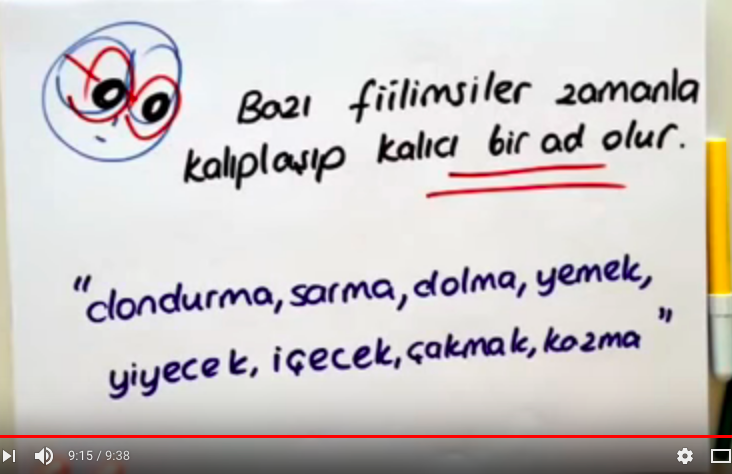 Сначала он пытается объяснить тупому ученику, как понять, что какое-то слово - производное от глагола. У нас таких проблем вообще нет, а у турок - с этим дело плохо обстоит. Поэтому его метод там - проверить, может ли слово делать отрицание через -ma и -me. И этим они там занимаются первые три минуты. На четвертой минуте - он объявляет три правила, по которым турки определяют, что слово - отглагольное.