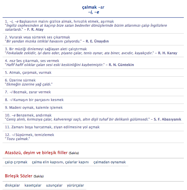 Я как-то в начальных уроках сказала, что у çalmak в английском переводе 57 значений. Смысла их все учить даже не было. Это как yüzmilyonlarca... Сразу мысль "чё-то дофига". Но теперь я "большая девочка... с черным платьем", и со связями в Правительстве. Поэтому, зажмурившись, снова постучалась к синему Ататюрку... Я к нему так часто хожу, что это уже неприлично выглядит... Ну и вот... Что сказать? В глубине души я всегда знала, что турки - не извращенцы. там коротенький списочек из 12 значений. Мелочи, по сравнению с тремя с лишним стами значений слова bir. Смотрите: