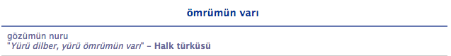 Так, ладно.. дальше ömrüne ömür katmak там в Правительстве. А у нас была песня - Sahici-124. Там женщина пела Ömrünü ömrüme yazmıştım... Это был какой-то слишком отвлеченный образ в то время, поэтому я подумала, что где yazmıştım, там и katmıştım. Правительство пишет, что это "sevinmesine, mutlu olmasına sebep olmak" - то есть - вознамериться быть счастливым и довольным. Это не совсем то, что в песне было, - по падежам это очевидно, - но всё равно значение где-то очень рядом бродит. Пока что с лопатой его искать не будем. Оно само нас найдет когда-нибудь... Идем дальше... Теперь мужчина опять поет...