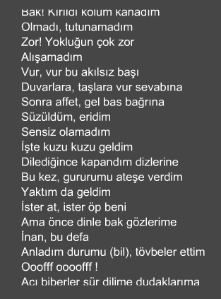 - Вся строчка откуда скопирована? Вот откуда, не глядя в авторство, можно было узнать, чьё творенье? İçime süzülür gizlice mahzun gözyaşlarım - это из Sorma... Тэтэ, у тебя опечатка в İçime на сайте, беги скорей исправляй, не разочаровывай мировое сообщество.
