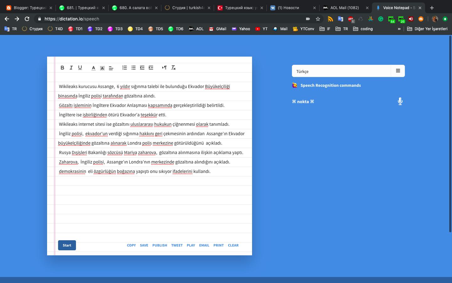 Дальше идете сюда: https://dictation.io/speech, выбираете там Турецкий справа в окошке, и читаете этот текст. Когда точка - делаете паузу в пару секунд и говорите "nokta", а если вам запятая нужна, то пауза и "virgül". А чтобы с новой строчки следующее - то пауза и "yeni satır", если что. Ваша задача - чтобы эта штука вас поняла и правильно всё за вами записала. Там можно нажать 'Start' и уйти в другую вкладку, в урок. Будете читать вслух текст отсюда, а оно всё равно будет всё "слышать" и записывать за вами.