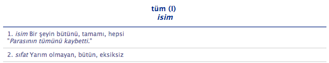 - И на слово "все" давайте посмотрим. Какая принципиальная разница между bütün и tüm, меня интересует... Вот вы такие вещи "делаете вид, что не замечаете" же. Ну, вроде, синонимы. Чтобы вы знали: синонимы - это похожие по значению слова, а не идентичные по значению. Всем лень изобретать по сто слов на одно значение, кто бы был идиотом, чтобы таким заниматься?! Поэтому нет двух совсем-совсем идентичных слов. Для чайников еще не позорно на синонимах играть, но просвещенным людям надо уметь пользоваться языком, как положено... Кем положено? Правительством... и синим Ататюрком у них там на главной странице... Вот...