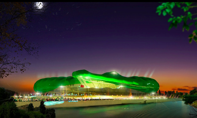 Это реальная фотография, а не картинка. Муниципальный стадион Бурсы. Мы в таком городе "на экскурсии" были в этом сезоне, да?... Круть занебесная, Timsah arena. Мы на этом стадионе слово "крокодил" выучили, помнится.